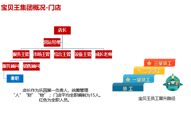 以IP打造/传播/运营为核心,以“儿童成长就在宝贝王” 为品牌理念,以儿童室内乐园及早教中心为发展平台,辐射整个儿童全产业链。