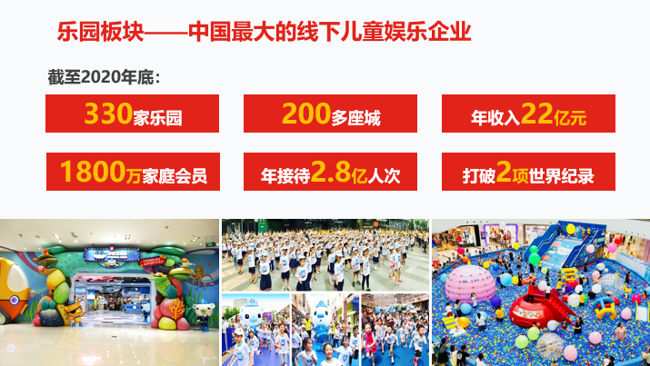 目前已形成万达宝贝王乐园,万达宝贝王线上教育,IP运营中心三大板块,服务全国千万亲子家庭。