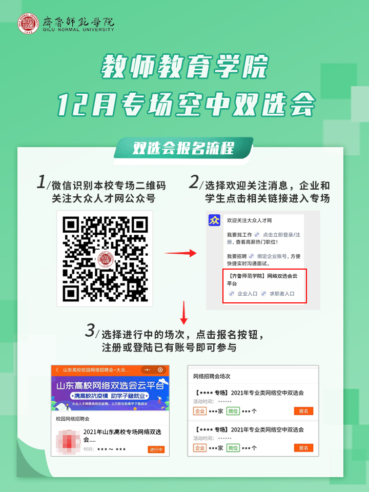 手机微信扫码关注“大众人才网”微信公众号,企业和毕业生分别点击相关按钮进入齐鲁师范学院专场,点击本学院报名按钮,注册或登录已有账号即可直接参与。