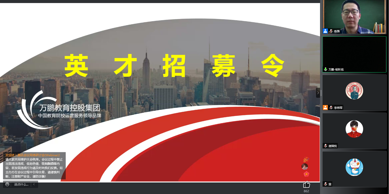 为促进毕业生积极就业,拓宽毕业生就业渠道,做好毕业生就业服务工作,5月27日下午14:30,教师教育学院联合学前教育学院、外国语学院,邀请山东省万鹏教育控股集团举办线上专场就业招聘宣讲会。此次会议由我院党委副书记练强主持,团总支书记李炜琛以及各学院毕业生参加本次宣讲会。