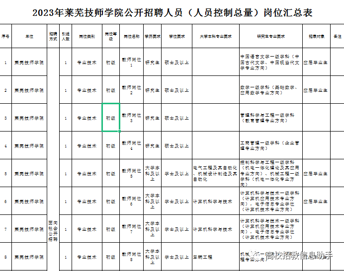 莱芜技师学院拟公开招聘人员12名,执行人员控制总量管理的相关规定。岗位条件、招聘人数等具体要求见《2023年莱芜技师学院公开招聘人员(人员控制总量)岗位汇总表》(附件1)。