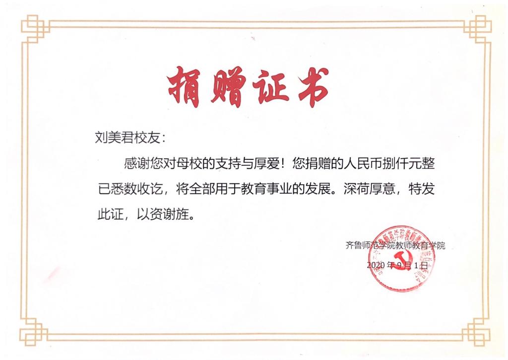 刘美君校友自大三起就萌发了捐赠国家奖学金的想法,如今付诸于实际,希望这笔钱能帮助到更多需要帮助的同学。刘美君认为自己只是普通学子中的一员,她感谢学院对自己的培养,感谢老师们对自己四年来的谆谆教诲,她说无论身在何处,都要做一个充满爱心和有责任心的人;不辜负母校的重托和期待,努力为母校增光添彩。刘美君校友已被东北师范大学录取为教育学原理专业全日制硕士研究生,即将开始新的求学之路。