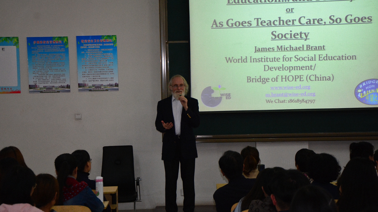 德高为师,身正为范,师德是一个教师的灵魂。为了更好的培养我院高素质,高水平的师范生,提高教学能力,我校于10月26日有幸邀请到来自美国的麦克•布兰特,他主要从事希望工程以及教师培训方面的工作内容。学院院长赵延银,副院长王铮,党总支书记陈宝金,党总支副书记赵青,办公室主任练强,辅导员老师以及各教研室主任、老师,2016级全体免费师范生和心理本科班同学都前来参加本次讲座。教室内座无虚席,同学们对本次讲座充满好奇与期待。
