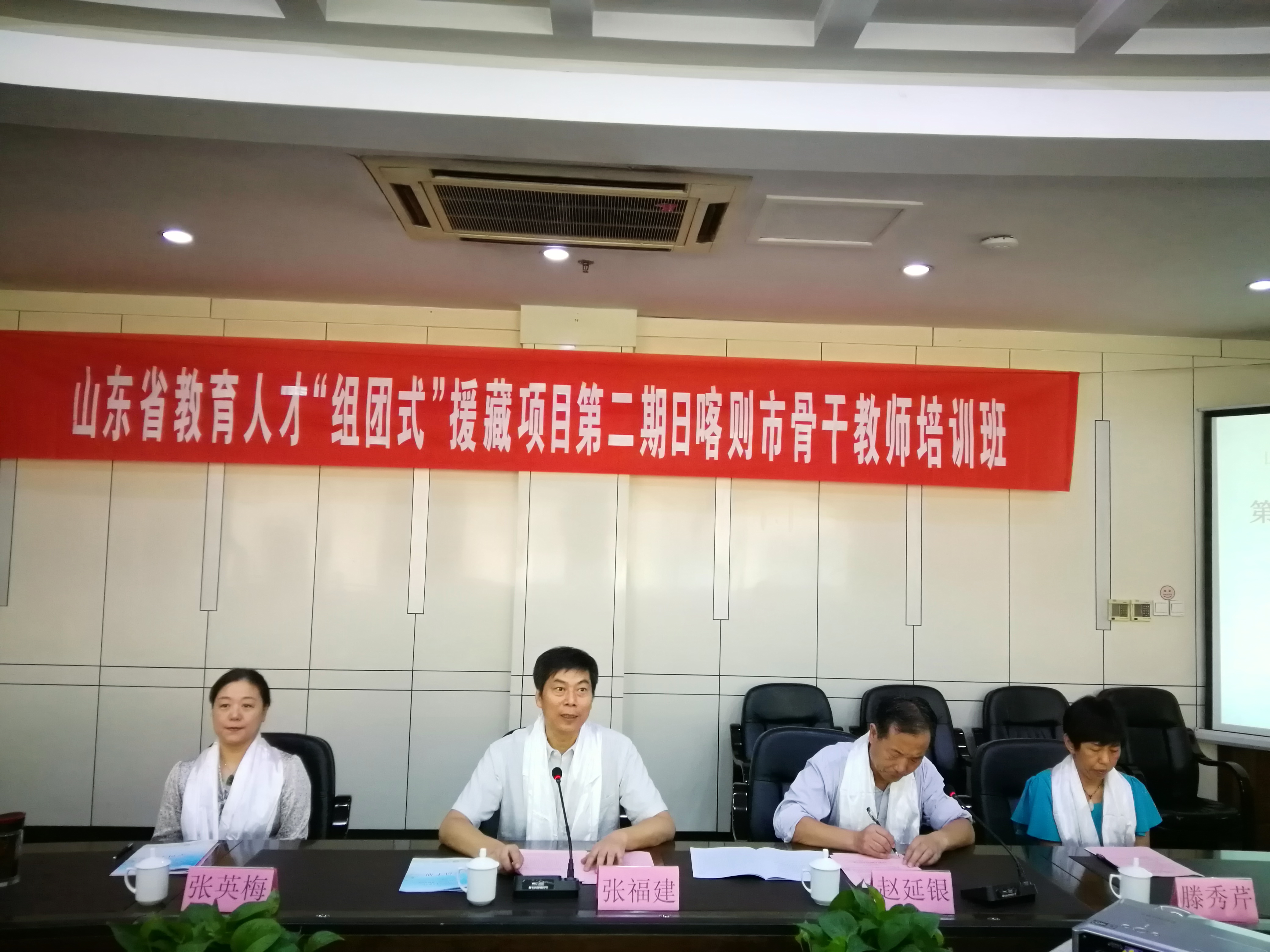 2017年9月9日上午,山东省教育人才“组团式”援藏项目——第二期日喀则市骨干教师培训班在济南开班,齐鲁师范学院党委委员、副校长张福建,齐鲁师范学院双语教师援疆教学中心主任、教师教育学院院长赵延银,齐鲁师范学院教师教育学院副院长张英梅等出席开班典礼并在主席台就坐。参加开班典礼的还有来自西藏日喀则市的30名骨干教师以及本次培训班班主任工作团队。开班典礼由赵延银院长主持。