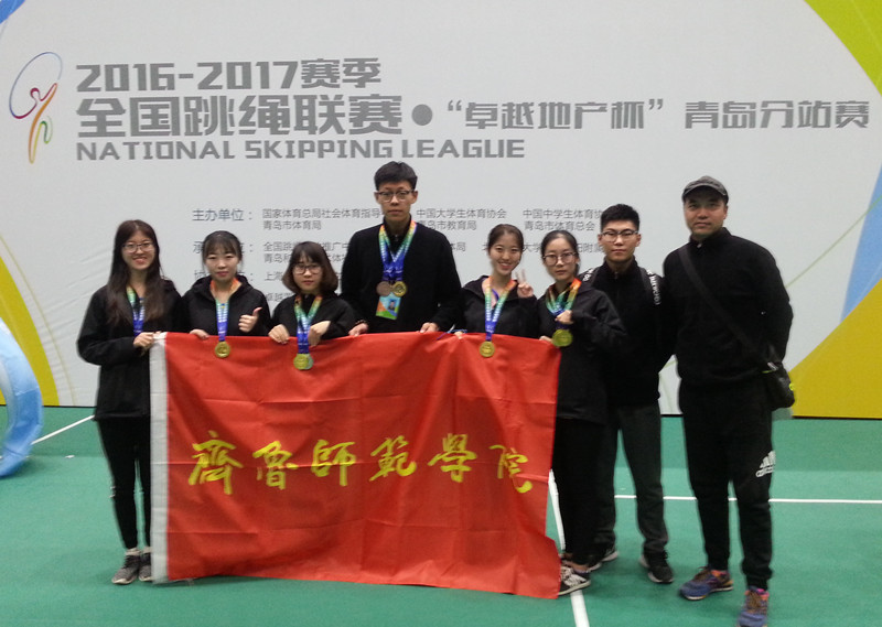 2016年11月19日-20日,2016-2017年全国跳绳联赛在青岛举行。本次比赛由国家体育总局社会体育指导中心、中国大学生体育协会、中国中学生体育协会、青岛市体育局、青岛市教育局、青岛市体育总会主办,是国内唯一由国家体育总局社会体育指导中心主办的全国性跳绳赛事。来自全国各地的42支队伍,包括山西财经大学、山东师范大学、成都大学、大连大学等高校、500多名选手参赛。在校领导的关心下,在教务处和体育学院的大力支持下,我院派出7名队员参赛,参赛运动员通过赛前刻苦训练,比赛时超水平发挥,在参加的8个项目比赛中,获得3个第一名、1个第三名、3个第七名。