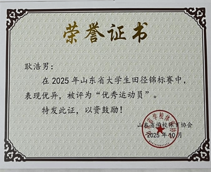在刚刚结束的2025年山东省大学生田径锦标赛中,学校教师教育学院学生耿浩男、张华峰奋力拼搏、勇创佳绩。其中耿浩男获得男子甲组10000米冠军、5000米亚军,张华峰获得男子甲组5000米铜牌。耿浩男被赛会评选为“优秀运动员”。