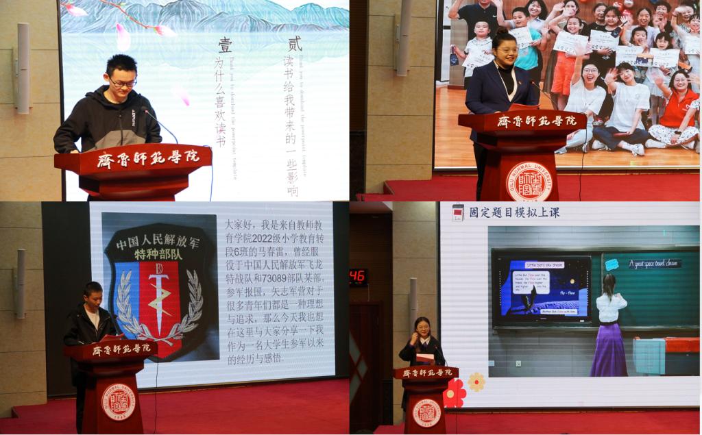 之后,学院团总支书记李炜琛对《教师教育学院2023年“学风建设年”实施方案》进行解读。最后,分别由浓郁书香代表潘剑桥、志愿服务王芝泽、参军入伍马春雷、学生竞赛王浩霖四位学生代表上台分享他们心得体会。学子们的精彩分享,赢得了同学们的热烈掌声。