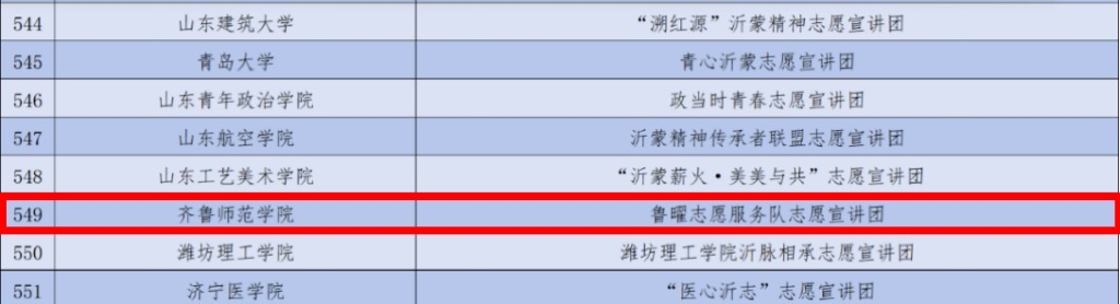 为深入学习宣传贯彻习近平新时代中国特色社会主义思想和党的二十届三中全会精神,落实“强国复兴有我”群众性主题宣传教育活动相关要求,引导动员青年学生大力弘扬沂蒙精神和遵义会议精神,赓续红色血脉,筑牢信仰之基,齐鲁师范学院鲁曜志愿服务队(志愿宣讲团)作为学校代表,积极参与2024年全国大学生沂蒙精神及遵义会议精神志愿宣讲团遴选,在全国共1188所高校志愿服务团共同角逐的情况下,鲁曜志愿服务队脱颖而出,成功入选!