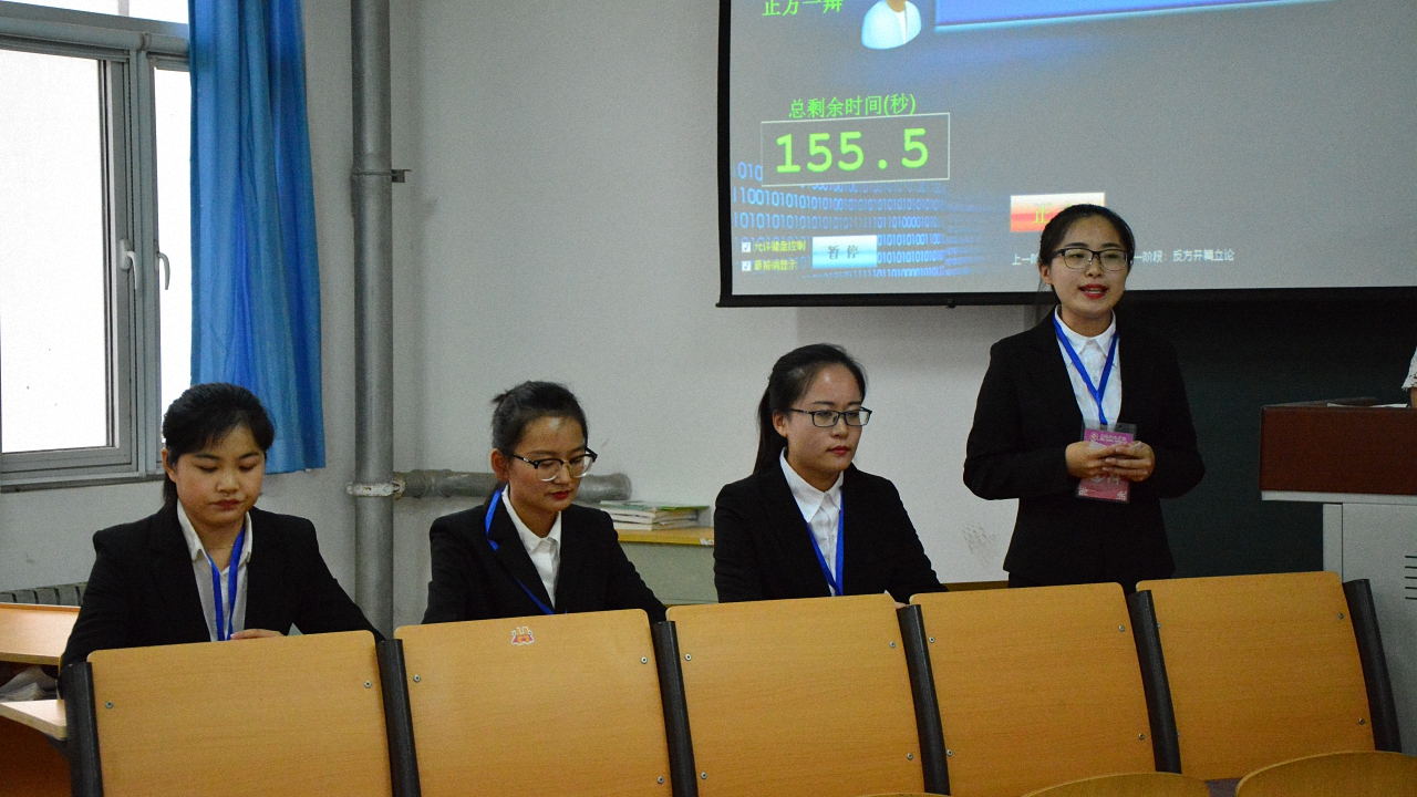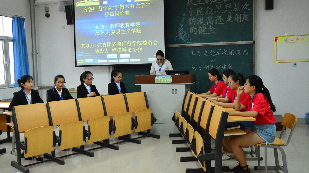 为丰富大学生校园生活,树立良好的精神面貌,由共青团齐鲁师范学院委员会主办,纵横辩论协会协办的齐鲁师范学院“争做六有大学生”校级辩论赛于2017年6月12日下午在二教A217举行。我院与马克思主义学院作为辩论赛的正反方围绕“民主的进程取决于民众思想层次还是制度的健全”展开辩论。经济与管理学院副主席李广旭、曲彦青,纵横辩论协会学习部部长高璐担任此次比赛的评委。