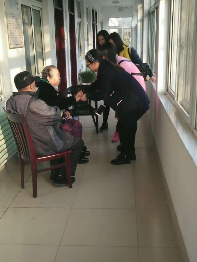 在工作人员有序的安排下,各成员开始了分工协作。为了让老人生活在一个舒适干净的环境,志愿者们为老人们打扫院子,擦窗户,拖地等,那埋头苦干的身影彰显了他们的努力与真情。志愿者们陪老人们聊天,给老人们捏肩捶背,从初始的陌生到心与心的交谈,哪怕是嘘寒问暖的小事也会让老人们喜笑颜开。老人还带头唱起了歌,一位95岁高龄的老奶奶为志愿者们唱了一首《妈妈的吻》,打动了每位志愿者的心。