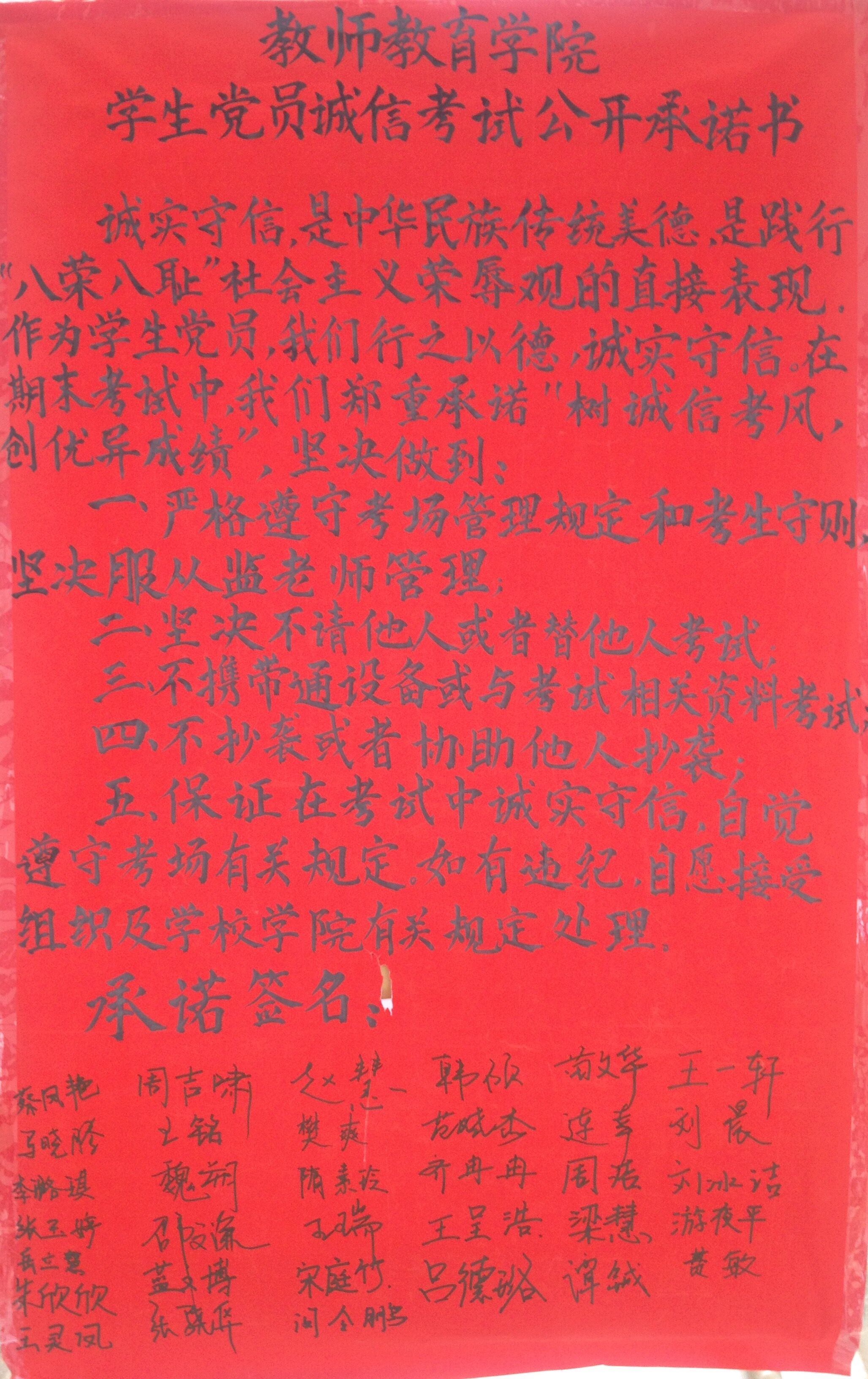 为进一步严肃学生考风考纪,营造文明、诚信考试的良好氛围,发挥学生党员模范带头作用,学生党支部在学生党员中组织开展了以“树诚信考风,创优异成绩”为主题的诚信考试公开承诺活动。
