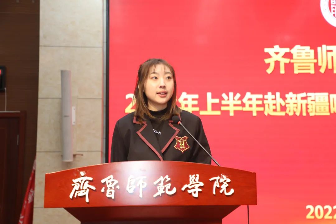 教师教育学院学生王靖婷代表全体支教团学生发言。她表示,同学们深知作为学校第一批赴疆支教成员所肩负的责任和使命,要严格遵守支教期间支教团的各项规章制度,并在踏上实习岗位之后,各方面严格要求自己,上好每一堂课,教育引导好每一名学生,努力练就自身教育教学本领。
