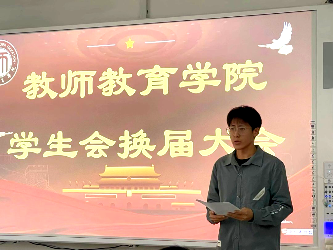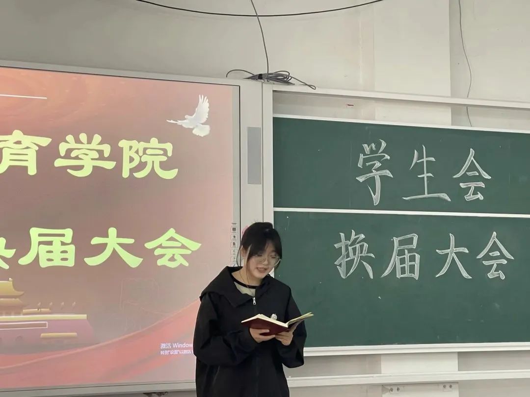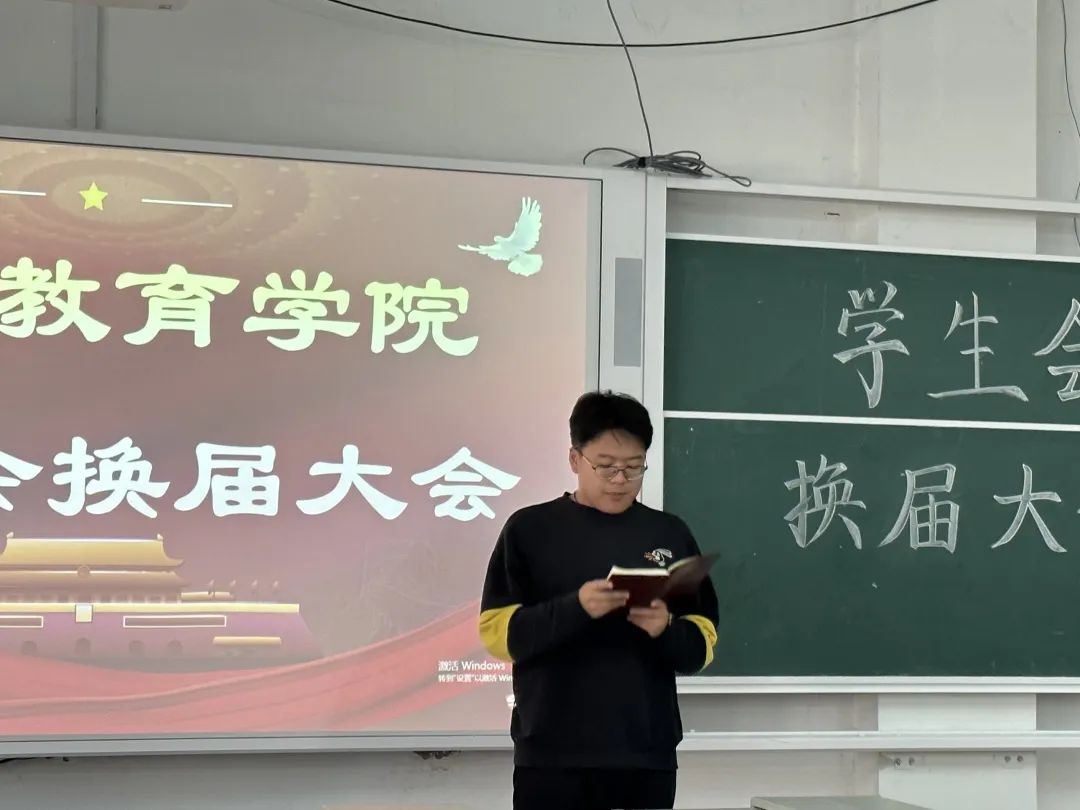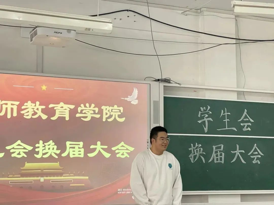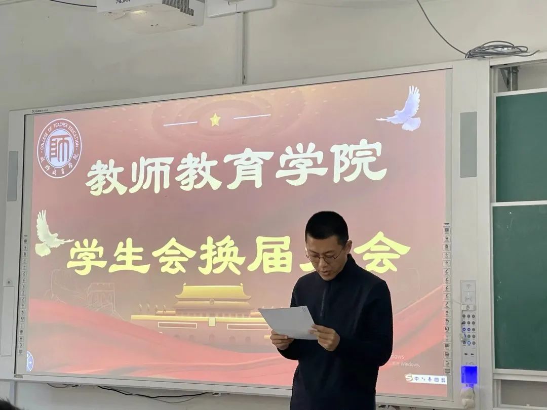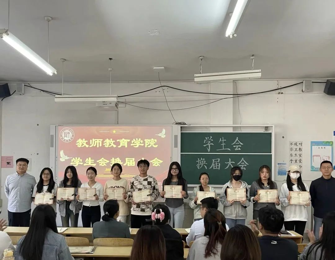 秋风萧瑟天气凉,草木摇落露为霜。10月25日,我院于二教A102教室召开学生会换届大会。教师教育学院党委书记姜东菲、党委副书记栾毅之、团总支书记李炜琛、团总支副书记王亚东以及各年级辅导员老师出席本次大会,2022届学生会主要学生干部和2023届学生会全体成员参加本次大会。本次会议由2022届主席团成员张浩宇主持。