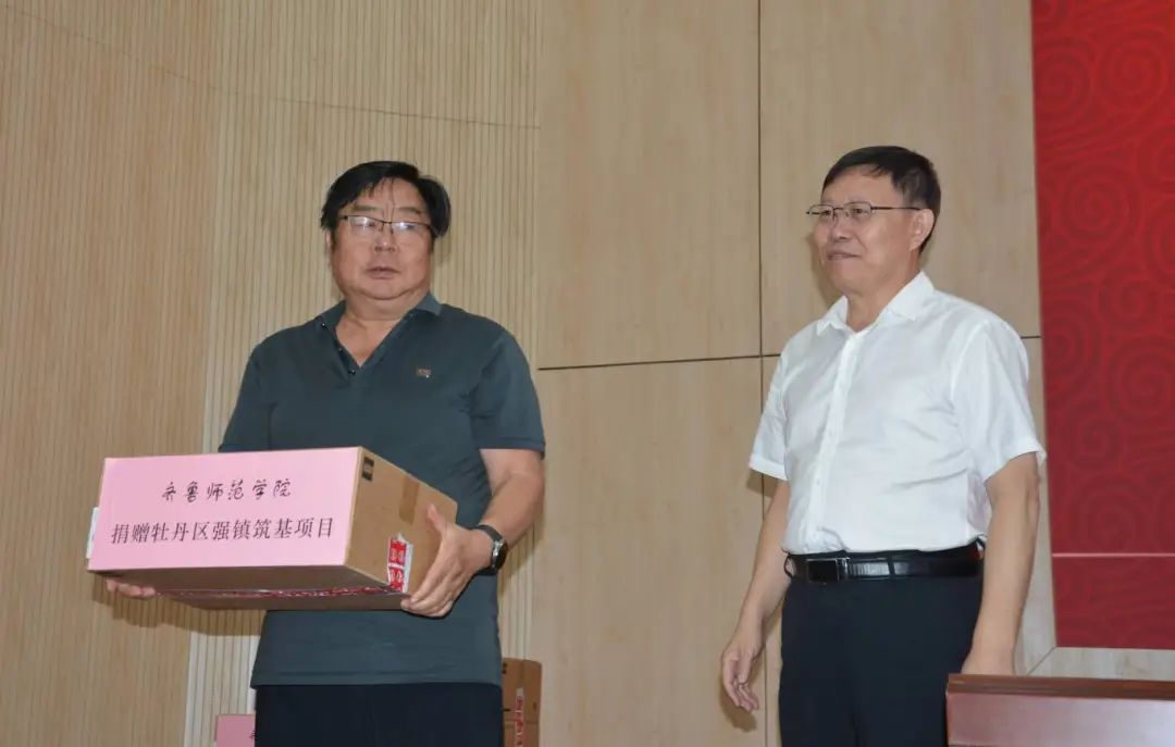 林松柏为柏毅颁发齐鲁师范学院科学教育首席指导专家聘书;与刘训才为科学教育实验区建设项目揭牌,为强镇筑基专项提升工程授牌;向李村镇中心幼儿园、李村镇贾庄小学、李村镇中心小学、李村镇中学等4个齐鲁师范学院基础教育联盟学校授牌,并为牡丹区强镇筑基镇——李村镇捐赠乐高科学教育实验器材。