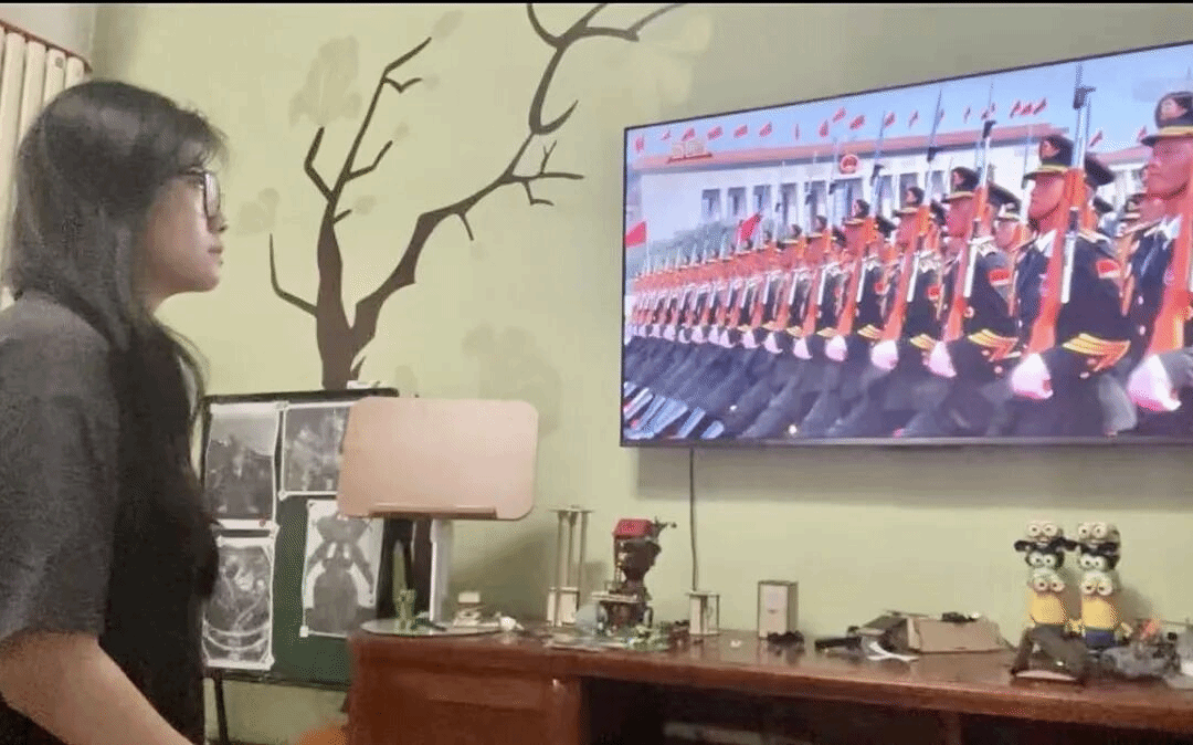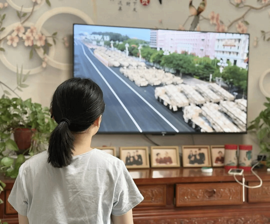 阅兵仪式上,威武之师步伐铿锵,掷地有声;大国重器傲然亮相,尽显底气。这是历史荣光与时代锋芒的交汇,是钢铁意志与民族精神的共鸣,尽显国家之强盛、军队之威严。学生党员们全神贯注地观看,眼中泛起泪光,难掩内心的激动与自豪。
