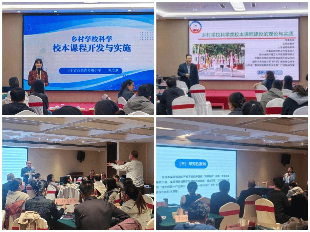 本次活动共邀请5名专家,全部为深耕小学科学教育一线的齐鲁名师、特级教师。山东省特级教师高霞作了《基于课本的项目化学习开发与实施》专题报告,围绕现行小学科学教材,系统阐释低成本实验开发的原则、路径与技巧,重点强调依托生活废旧材料,实现实验教学的生活化、安全性与探究性,为乡村学校破解实验资源不足难题提供了可操作的解决方案。随后,齐鲁名师、特级教师范明刚聚焦《乡村学校科学校本课程建设的理论与实践》,为参训教师厘清校本课程开发的理论框架、核心要素与多元路径,引导教师立足乡村实际,打造具有本土特色的科学课程体系。
